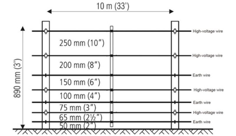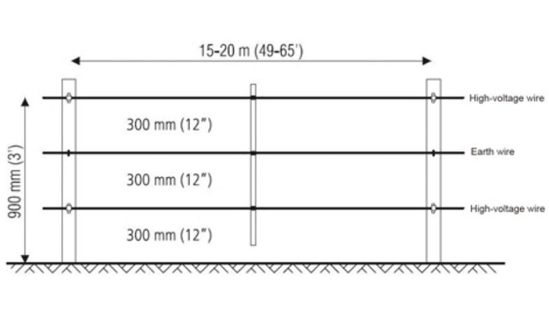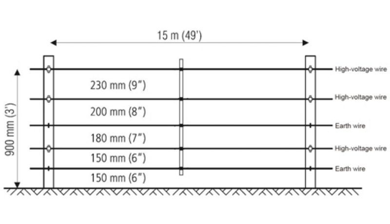 Mae anifeiliaid â natur anniddig yn defnyddio 7 cebl, gyda bwlch o 10 metr rhwng polion pren a gwialen sefydlogi ganolraddol.